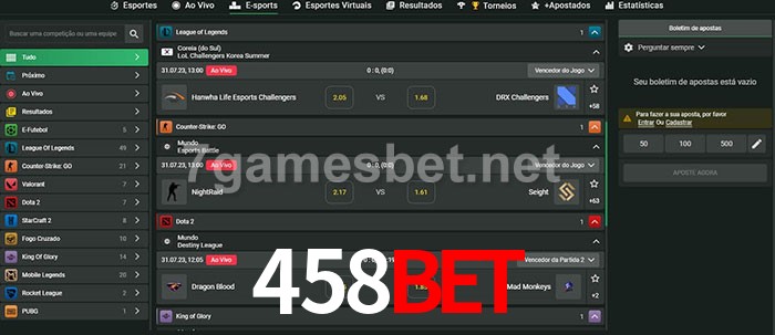 O 458bet oferece uma grande seleção de opções de apostas em e-sports com probabilidades competitivas